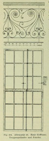 Im Flur ein schönes Flacheisengeländer an der Treppe (Bild unten links). Die Fenster des Treppenhauses als Schiebefenster konstruiert. In dem Eckzimmer des ersten Stockes eine einfache Stuckdecke. Besonders hübsch der Anblick des Hauses aus der Burgstraße, in die es mit dem westlichen Risalit hineinragt.