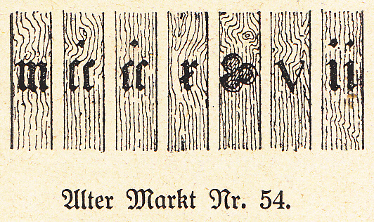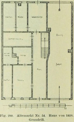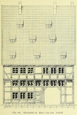 Nr. 54 (1516). Neun Spann lang, EG mit ZG, vorkragendes OG. Der Grundriß (Bild unten links) ist der typische eines . Die drei hinteren Räume gehören zu einem jüngeren Anbau. Eine Durchfahrt führt rechts zum Hofe. Ursprünglich war sie größer; ein mächtiger Unterzug, der auf einem Pfosten ruht, stützt ihre Decke. Die ursprüngliche Treppe ging an einer ähnlichen Stelle wie jetzt in die Höhe, um vom Podest aus die Kammern des Zwischengeschosses sowie den vorkragenden ersten Stock zu erreichen. Auf dessen Ständern ist die Jahreszahl: m ∙ c ∙ c ∙ c ∙ c ∙ x ∙ vii (1418) (Bild unten) eingestochen. Das weit ausladende Obergeschoß hatte ursprünglich einfach profilierte Knaggen, die jetzigen Zierteile davor sind neu (Bild unten rechts).