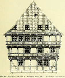 Das Vorkragen des Obergeschosses war ein dem niedersächsischen Fachwerkhaus eigenes Merkmal und belebte seine Fassade ungemein. Doch schien diese reizvoll wirkende Bauweise nur die Notwendigkeit der Raumersparnis zugrunde gelegen haben. Zwischen dem Unter- und Obergeschoß entstand infolge der großen Höhe der Durchfahrt, die sonst eine unwirtschaftliche Höhe der neben ihr liegenden Zimmer zur Folge gehabt hätte, das Zwischengeschoß.