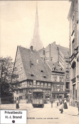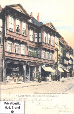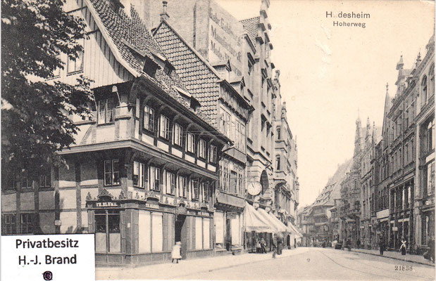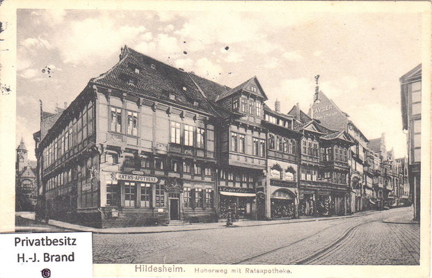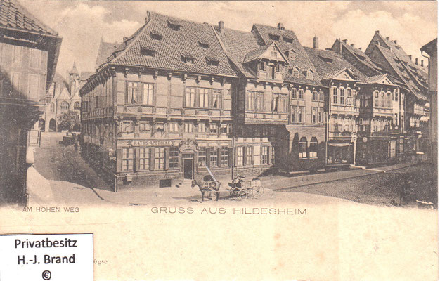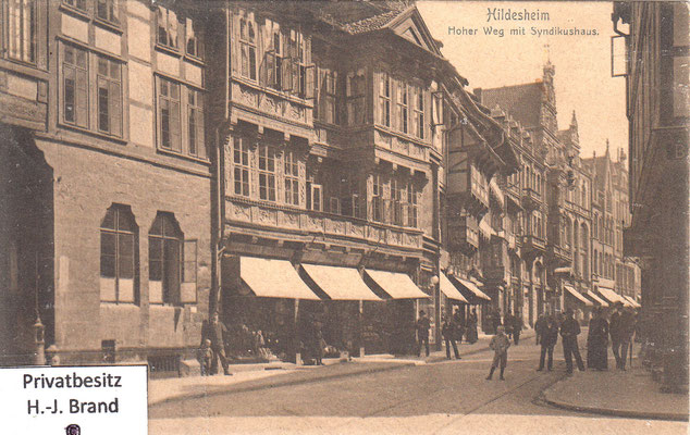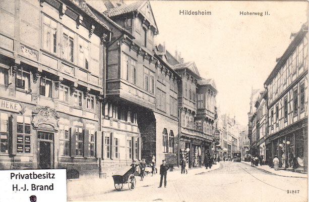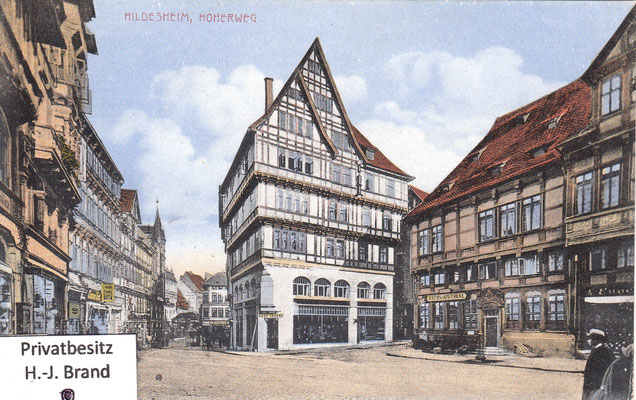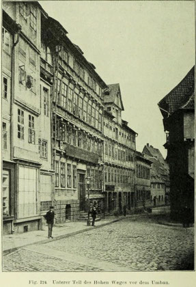 Als moderne Geschäftsstraße ist der Hohe Weg fast vollständig erneuert; eine Ansicht seines Aussehens vor dem Umbau zeigt Bild rechts; links die Ratsweinschenke in der ursprünglichen Form, dahinter die Häuser der Almsstraße, rechts der Hoken.