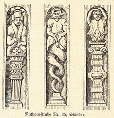 [20] das Koch'sche Haus, schräg gegenüber der Ratsapotheke liegend, ist ein Neubau, an dem der ganze reiche Bildeschmuck und das Schnitzwerk der Stiele wie des gesamten Holzwerkes des alten Hauses, der Ratsweinschenke von 1612, wieder verwandt ist.